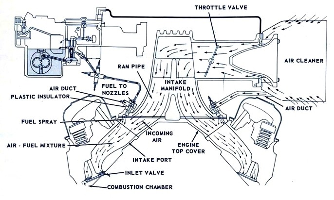 Enter the 1957 Rambler Rebel 327 with optional Bendix Electrojector Electronic Fuel Injection. While complicated in concept for 1957, the execution was remarkably simple. Electrojector required more additional parts than a mechanical injection system, but those extra parts were surprisingly simple. All Electrojector needed was an electric fuel pump to put out 20psi (which was already well developed by the aerospace industry), a fuel rail, injectors, a special distributor with a second set of pickups to engage the injectors, and an electronic modulator with sensors for vacuum, atmospheric pressure, and temperature to help the modulator understand exactly how much fuel each cylinder needed. This had a number of benefits over GM’s Rochester system. Electrojector had some vacuum input, but was not vacuum driven so vacuum leaks were less likely, and frankly, less of an issue than with existing mechanical fuel injection systems. The Bendix system metered out fuel per cylinder, rather than to the engine as a whole, as did a Ramjet, or a carburetor, for that matter. The fuel pump could be moronically straightforward–it only had to create 20psi of constant fuel pressure and was not responsible for metering fuel like the complicated mechanical pumps of mechanical injection systems. Rather, metering was carried out solely by the injectors (one-per-cylinder I might remind you) that opened based off of an electrical pickup on the distributor, and closed based on a signal from the electrical modulator (think of it as an early computer) based on RPM, atmospheric pressure, and temperature that determined the duration of fuel injection per cylinder cycle.