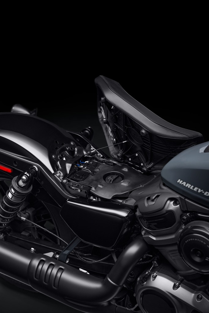 However, the real centerpiece of the Nightster reveal is the long-awaited intermediate Revolution Max engine, the 975T. Like its larger Revo Max 1250T brethren, the 975T features a 60°, liquid-cooled V-Twin. If you’re not a cooling fin fetishist, you might find the motor to be attractive, with the liquid-cooled design allowing designers to place standout satin accents on the cylinder jugs that complement the dark Nightster trim nicely. Like the currently-produced 1250T, the Nightster motor is a similarly feature-rich motor, with variable valve timing and maintenance-free hydraulic valve lifters that H-D owners have happily ignored for decades. The 975T allegedly puts out 90 horsepower, giving the 81hp Rebel 1100 a tough matchup on the street, although the power premium also correlates with a cost premium of around $3k over the decidedly less attractive Honda. Keeping with the theme of increased performance, the new Nightster allegedly weighs ~75 pounds less than the outgoing 1200 Sportster as well, although most motorcycle manufacturers fudge their wet weight numbers.